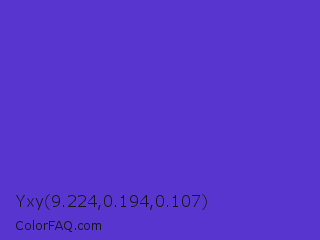 Yxy 9.224,0.194,0.107 Color is a normal indigo color and the nearest color is Purple Heart Crayola #652dc1. Hex code #5935d0 and RGB value is rgb(89,53,208). In RGB color space, this color is composed of 35% red, 21% green, 82% blue, In CMYK color space, this color is composed of 57% cyan, 75% magenta, 0% yellow , 18% black , In HSL color space, this color has a hue angle of 254° , 62% saturation and 51% lightness.