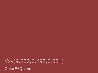 Yxy 9.232,0.497,0.331 Color is a normal red color and the nearest color is Sanguine Brown #8d3d38. Hex code #913938 and RGB value is rgb(145,57,56). In RGB color space, this color is composed of 57% red, 22% green, 22% blue, In CMYK color space, this color is composed of 0% cyan, 61% magenta, 61% yellow , 43% black , In HSL color space, this color has a hue angle of 1° , 44% saturation and 39% lightness.