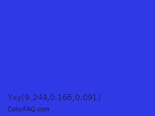 Yxy 9.244,0.166,0.091 Color is a normal blue color and the nearest color is Palatinate Blue #273be2. Hex code #2f39e6 and RGB value is rgb(47,57,230). In RGB color space, this color is composed of 18% red, 22% green, 90% blue, In CMYK color space, this color is composed of 80% cyan, 75% magenta, 0% yellow , 10% black , In HSL color space, this color has a hue angle of 237° , 79% saturation and 54% lightness.