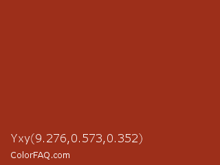 Yxy 9.276,0.573,0.352 Color is a normal red color and the nearest color is Cognac #9f381d. Hex code #9d2f1a and RGB value is rgb(157,47,26). In RGB color space, this color is composed of 62% red, 18% green, 10% blue, In CMYK color space, this color is composed of 0% cyan, 70% magenta, 83% yellow , 38% black , In HSL color space, this color has a hue angle of 10° , 72% saturation and 36% lightness.