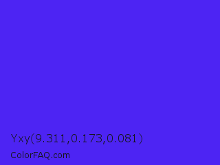 Yxy 9.311,0.173,0.081 Color is a normal indigo color and the nearest color is Han Purple #5218fa. Hex code #4d24f3 and RGB value is rgb(77,36,243). In RGB color space, this color is composed of 30% red, 14% green, 95% blue, In CMYK color space, this color is composed of 68% cyan, 85% magenta, 0% yellow , 5% black , In HSL color space, this color has a hue angle of 252° , 90% saturation and 55% lightness.