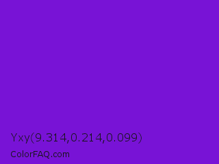 Yxy 9.314,0.214,0.099 Color is a normal purple color and the nearest color is French Violet #8806ce. Hex code #7813d6 and RGB value is rgb(120,19,214). In RGB color space, this color is composed of 47% red, 7% green, 84% blue, In CMYK color space, this color is composed of 44% cyan, 91% magenta, 0% yellow , 16% black , In HSL color space, this color has a hue angle of 271° , 84% saturation and 46% lightness.