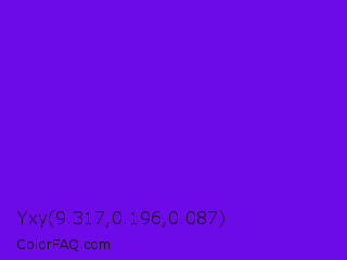 Yxy 9.317,0.196,0.087 Color is a normal violet color and the nearest color is Electric Indigo #6f00ff. Hex code #6d0be8 and RGB value is rgb(109,11,232). In RGB color space, this color is composed of 43% red, 4% green, 91% blue, In CMYK color space, this color is composed of 53% cyan, 95% magenta, 0% yellow , 9% black , In HSL color space, this color has a hue angle of 267° , 91% saturation and 48% lightness.