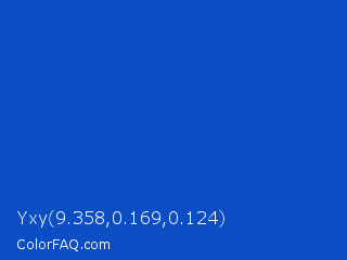 Yxy 9.358,0.169,0.124 Color is a normal blue color and the nearest color is Sapphire #0f52ba. Hex code #0b4dc4 and RGB value is rgb(11,77,196). In RGB color space, this color is composed of 4% red, 30% green, 77% blue, In CMYK color space, this color is composed of 94% cyan, 61% magenta, 0% yellow , 23% black , In HSL color space, this color has a hue angle of 219° , 89% saturation and 41% lightness.