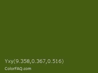 Yxy 9.358,0.367,0.516 Color is a very dark lime color and the nearest color is Green Leaf #436a0d. Hex code #465e14 and RGB value is rgb(70,94,20). In RGB color space, this color is composed of 27% red, 37% green, 8% blue, In CMYK color space, this color is composed of 26% cyan, 0% magenta, 79% yellow , 63% black , In HSL color space, this color has a hue angle of 79° , 65% saturation and 22% lightness.