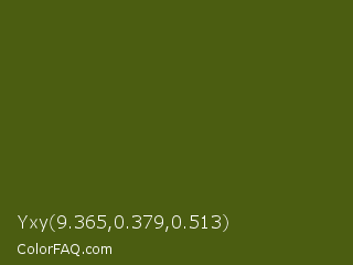 Yxy 9.365,0.379,0.513 Color is a very dark lime color and the nearest color is Saratoga #555b10. Hex code #4b5d11 and RGB value is rgb(75,93,17). In RGB color space, this color is composed of 29% red, 36% green, 7% blue, In CMYK color space, this color is composed of 19% cyan, 0% magenta, 82% yellow , 64% black , In HSL color space, this color has a hue angle of 74° , 69% saturation and 22% lightness.