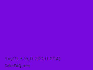 Yxy 9.376,0.209,0.094 Color is a normal purple color and the nearest color is French Violet #8806ce. Hex code #7709de and RGB value is rgb(119,9,222). In RGB color space, this color is composed of 47% red, 4% green, 87% blue, In CMYK color space, this color is composed of 46% cyan, 96% magenta, 0% yellow , 13% black , In HSL color space, this color has a hue angle of 271° , 92% saturation and 45% lightness.