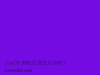 Yxy 9.399,0.203,0.091 Color is a normal violet color and the nearest color is French Violet #8806ce. Hex code #730be2 and RGB value is rgb(115,11,226). In RGB color space, this color is composed of 45% red, 4% green, 89% blue, In CMYK color space, this color is composed of 49% cyan, 95% magenta, 0% yellow , 11% black , In HSL color space, this color has a hue angle of 269° , 91% saturation and 46% lightness.