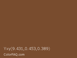 Yxy 9.431,0.453,0.389 Color is a normal orange color and the nearest color is Old Copper #724a2f. Hex code #794c2e and RGB value is rgb(121,76,46). In RGB color space, this color is composed of 47% red, 30% green, 18% blue, In CMYK color space, this color is composed of 0% cyan, 37% magenta, 62% yellow , 53% black , In HSL color space, this color has a hue angle of 24° , 45% saturation and 33% lightness.