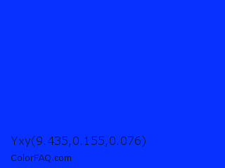 Yxy 9.435,0.155,0.076 Color is a normal blue color and the nearest color is Blue RYB #0247fe. Hex code #0831ff and RGB value is rgb(8,49,255). In RGB color space, this color is composed of 3% red, 19% green, 100% blue, In CMYK color space, this color is composed of 97% cyan, 81% magenta, 0% yellow , 0% black , In HSL color space, this color has a hue angle of 230° , 100% saturation and 52% lightness.