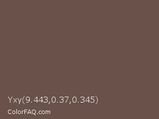 Yxy 9.443,0.37,0.345 Color is a normal red color and the nearest color is Medium Taupe #674c47. Hex code #6a514a and RGB value is rgb(106,81,74). In RGB color space, this color is composed of 42% red, 32% green, 29% blue, In CMYK color space, this color is composed of 0% cyan, 24% magenta, 30% yellow , 58% black , In HSL color space, this color has a hue angle of 13° , 18% saturation and 35% lightness.