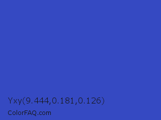 Yxy 9.444,0.181,0.126 Color is a normal blue color and the nearest color is Cerulean Blue #2a52be. Hex code #3549c2 and RGB value is rgb(53,73,194). In RGB color space, this color is composed of 21% red, 29% green, 76% blue, In CMYK color space, this color is composed of 73% cyan, 62% magenta, 0% yellow , 24% black , In HSL color space, this color has a hue angle of 231° , 57% saturation and 48% lightness.