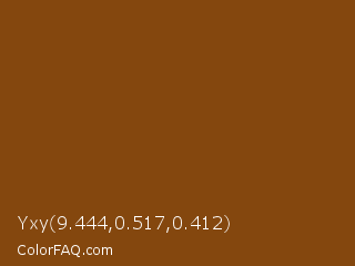 Yxy 9.444,0.517,0.412 Color is a dark orange color and the nearest color is Saddle Brown #8b4513. Hex code #84470e and RGB value is rgb(132,71,14). In RGB color space, this color is composed of 52% red, 28% green, 5% blue, In CMYK color space, this color is composed of 0% cyan, 46% magenta, 89% yellow , 48% black , In HSL color space, this color has a hue angle of 29° , 81% saturation and 29% lightness.