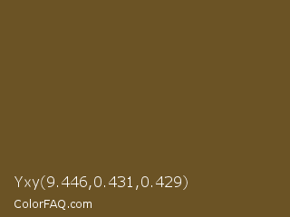 Yxy 9.446,0.431,0.429 Color is a dark orange color and the nearest color is Field Drab #6c541e. Hex code #6b5325 and RGB value is rgb(107,83,37). In RGB color space, this color is composed of 42% red, 33% green, 15% blue, In CMYK color space, this color is composed of 0% cyan, 22% magenta, 65% yellow , 58% black , In HSL color space, this color has a hue angle of 39° , 49% saturation and 28% lightness.