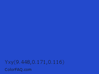 Yxy 9.448,0.171,0.116 Color is a normal blue color and the nearest color is New Car #214fc6. Hex code #2349cc and RGB value is rgb(35,73,204). In RGB color space, this color is composed of 14% red, 29% green, 80% blue, In CMYK color space, this color is composed of 83% cyan, 64% magenta, 0% yellow , 20% black , In HSL color space, this color has a hue angle of 227° , 71% saturation and 47% lightness.