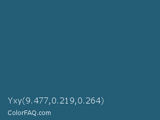 Yxy 9.477,0.219,0.264 Color is a dark blue color and the nearest color is Blumine #18587a. Hex code #235d76 and RGB value is rgb(35,93,118). In RGB color space, this color is composed of 14% red, 36% green, 46% blue, In CMYK color space, this color is composed of 70% cyan, 21% magenta, 0% yellow , 54% black , In HSL color space, this color has a hue angle of 198° , 54% saturation and 30% lightness.