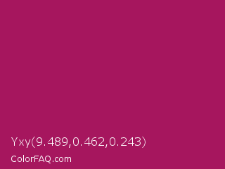 Yxy 9.489,0.462,0.243 Color is a normal rose color and the nearest color is Jazzberry Jam #a50b5e. Hex code #a6165e and RGB value is rgb(166,22,94). In RGB color space, this color is composed of 65% red, 9% green, 37% blue, In CMYK color space, this color is composed of 0% cyan, 87% magenta, 43% yellow , 35% black , In HSL color space, this color has a hue angle of 330° , 77% saturation and 37% lightness.