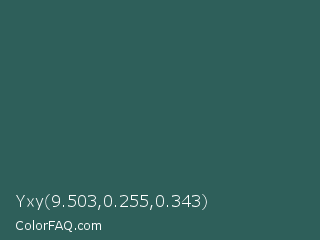 Yxy 9.503,0.255,0.343 Color is a dark cyan color and the nearest color is Spectra #2f5a57. Hex code #2e5f5a and RGB value is rgb(46,95,90). In RGB color space, this color is composed of 18% red, 37% green, 35% blue, In CMYK color space, this color is composed of 52% cyan, 0% magenta, 5% yellow , 63% black , In HSL color space, this color has a hue angle of 174° , 35% saturation and 28% lightness.