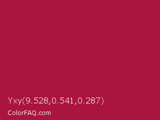 Yxy 9.528,0.541,0.287 Color is a normal rose color and the nearest color is French Wine #ac1e44. Hex code #ab1440 and RGB value is rgb(171,20,64). In RGB color space, this color is composed of 67% red, 8% green, 25% blue, In CMYK color space, this color is composed of 0% cyan, 88% magenta, 63% yellow , 33% black , In HSL color space, this color has a hue angle of 343° , 79% saturation and 37% lightness.