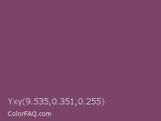 Yxy 9.535,0.351,0.255 Color is a normal magenta color and the nearest color is Cannon Pink #894367. Hex code #7d446a and RGB value is rgb(125,68,106). In RGB color space, this color is composed of 49% red, 27% green, 42% blue, In CMYK color space, this color is composed of 0% cyan, 46% magenta, 15% yellow , 51% black , In HSL color space, this color has a hue angle of 320° , 30% saturation and 38% lightness.