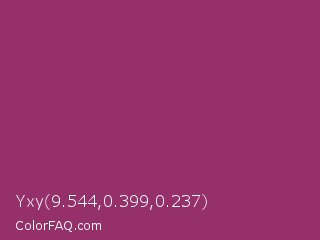 Yxy 9.544,0.399,0.237 Color is a normal magenta color and the nearest color is Amaranth Deep Purple #9f2b68. Hex code #95306a and RGB value is rgb(149,48,106). In RGB color space, this color is composed of 58% red, 19% green, 42% blue, In CMYK color space, this color is composed of 0% cyan, 68% magenta, 29% yellow , 42% black , In HSL color space, this color has a hue angle of 326° , 51% saturation and 39% lightness.