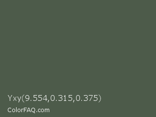 Yxy 9.554,0.315,0.375 Color is a normal green color and the nearest color is Nandor #4b5d52. Hex code #4d5b4a and RGB value is rgb(77,91,74). In RGB color space, this color is composed of 30% red, 36% green, 29% blue, In CMYK color space, this color is composed of 15% cyan, 0% magenta, 19% yellow , 64% black , In HSL color space, this color has a hue angle of 109° , 10% saturation and 32% lightness.