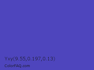 Yxy 9.55,0.197,0.13 Color is a normal indigo color and the nearest color is Ocean Blue #4f42b5. Hex code #4e45bd and RGB value is rgb(78,69,189). In RGB color space, this color is composed of 31% red, 27% green, 74% blue, In CMYK color space, this color is composed of 59% cyan, 63% magenta, 0% yellow , 26% black , In HSL color space, this color has a hue angle of 245° , 48% saturation and 51% lightness.