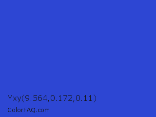 Yxy 9.564,0.172,0.11 Color is a normal blue color and the nearest color is Palatinate Blue #273be2. Hex code #2d46d3 and RGB value is rgb(45,70,211). In RGB color space, this color is composed of 18% red, 27% green, 83% blue, In CMYK color space, this color is composed of 79% cyan, 67% magenta, 0% yellow , 17% black , In HSL color space, this color has a hue angle of 231° , 65% saturation and 50% lightness.