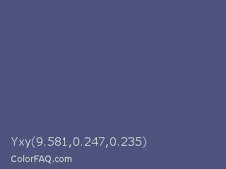 Yxy 9.581,0.247,0.235 Color is a normal blue color and the nearest color is Purple Navy #4e5180. Hex code #4d557e and RGB value is rgb(77,85,126). In RGB color space, this color is composed of 30% red, 33% green, 49% blue, In CMYK color space, this color is composed of 39% cyan, 33% magenta, 0% yellow , 51% black , In HSL color space, this color has a hue angle of 230° , 24% saturation and 40% lightness.