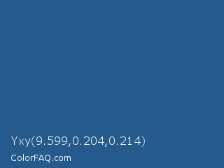 Yxy 9.599,0.204,0.214 Color is a normal blue color and the nearest color is B Dazzled Blue #2e5894. Hex code #255a8c and RGB value is rgb(37,90,140). In RGB color space, this color is composed of 15% red, 35% green, 55% blue, In CMYK color space, this color is composed of 74% cyan, 36% magenta, 0% yellow , 45% black , In HSL color space, this color has a hue angle of 209° , 58% saturation and 35% lightness.