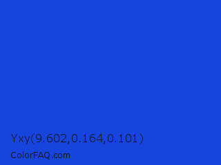 Yxy 9.602,0.164,0.101 Color is a normal blue color and the nearest color is Palatinate Blue #273be2. Hex code #1844de and RGB value is rgb(24,68,222). In RGB color space, this color is composed of 9% red, 27% green, 87% blue, In CMYK color space, this color is composed of 89% cyan, 69% magenta, 0% yellow , 13% black , In HSL color space, this color has a hue angle of 227° , 80% saturation and 48% lightness.