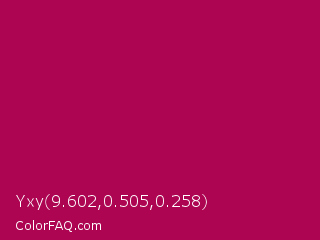 Yxy 9.602,0.505,0.258 Color is a normal rose color and the nearest color is Jazzberry Jam #a50b5e. Hex code #ad0552 and RGB value is rgb(173,5,82). In RGB color space, this color is composed of 68% red, 2% green, 32% blue, In CMYK color space, this color is composed of 0% cyan, 97% magenta, 53% yellow , 32% black , In HSL color space, this color has a hue angle of 333° , 94% saturation and 35% lightness.