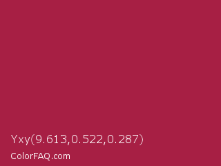 Yxy 9.613,0.522,0.287 Color is a normal rose color and the nearest color is French Wine #ac1e44. Hex code #a71f44 and RGB value is rgb(167,31,68). In RGB color space, this color is composed of 65% red, 12% green, 27% blue, In CMYK color space, this color is composed of 0% cyan, 81% magenta, 59% yellow , 35% black , In HSL color space, this color has a hue angle of 344° , 69% saturation and 39% lightness.
