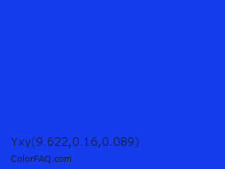 Yxy 9.622,0.16,0.089 Color is a normal blue color and the nearest color is Palatinate Blue #273be2. Hex code #163ded and RGB value is rgb(22,61,237). In RGB color space, this color is composed of 9% red, 24% green, 93% blue, In CMYK color space, this color is composed of 91% cyan, 74% magenta, 0% yellow , 7% black , In HSL color space, this color has a hue angle of 229° , 86% saturation and 51% lightness.