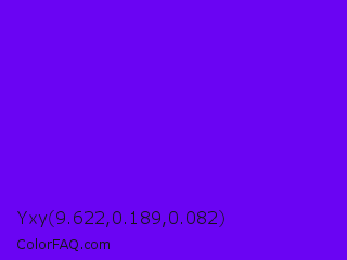 Yxy 9.622,0.189,0.082 Color is a normal violet color and the nearest color is Electric Indigo #6f00ff. Hex code #6a04f3 and RGB value is rgb(106,4,243). In RGB color space, this color is composed of 42% red, 2% green, 95% blue, In CMYK color space, this color is composed of 56% cyan, 98% magenta, 0% yellow , 5% black , In HSL color space, this color has a hue angle of 266° , 97% saturation and 48% lightness.