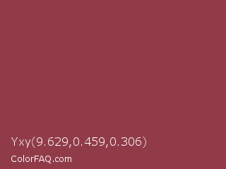 Yxy 9.629,0.459,0.306 Color is a normal red color and the nearest color is Smoky Topaz #933d41. Hex code #913b49 and RGB value is rgb(145,59,73). In RGB color space, this color is composed of 57% red, 23% green, 29% blue, In CMYK color space, this color is composed of 0% cyan, 59% magenta, 50% yellow , 43% black , In HSL color space, this color has a hue angle of 350° , 42% saturation and 40% lightness.