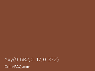 Yxy 9.682,0.47,0.372 Color is a normal orange color and the nearest color is Nutmeg #81422c. Hex code #834831 and RGB value is rgb(131,72,49). In RGB color space, this color is composed of 51% red, 28% green, 19% blue, In CMYK color space, this color is composed of 0% cyan, 45% magenta, 63% yellow , 49% black , In HSL color space, this color has a hue angle of 17° , 46% saturation and 35% lightness.