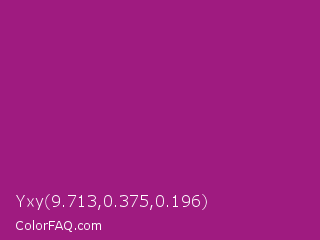 Yxy 9.713,0.375,0.196 Color is a normal magenta color and the nearest color is Violet Eggplant #991199. Hex code #9f1b80 and RGB value is rgb(159,27,128). In RGB color space, this color is composed of 62% red, 11% green, 50% blue, In CMYK color space, this color is composed of 0% cyan, 83% magenta, 19% yellow , 38% black , In HSL color space, this color has a hue angle of 314° , 71% saturation and 36% lightness.