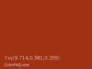 Yxy 9.714,0.581,0.359 Color is a normal red color and the nearest color is Tabasco #a02712. Hex code #a03112 and RGB value is rgb(160,49,18). In RGB color space, this color is composed of 63% red, 19% green, 7% blue, In CMYK color space, this color is composed of 0% cyan, 69% magenta, 89% yellow , 37% black , In HSL color space, this color has a hue angle of 13° , 80% saturation and 35% lightness.