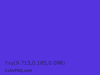 Yxy 9.715,0.185,0.098 Color is a normal indigo color and the nearest color is Majorelle Blue #6050dc. Hex code #5534e0 and RGB value is rgb(85,52,224). In RGB color space, this color is composed of 33% red, 20% green, 88% blue, In CMYK color space, this color is composed of 62% cyan, 77% magenta, 0% yellow , 12% black , In HSL color space, this color has a hue angle of 252° , 74% saturation and 54% lightness.