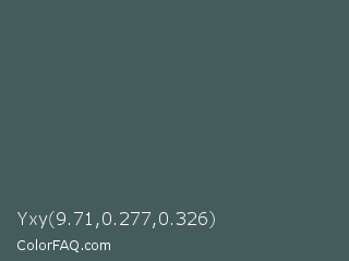 Yxy 9.71,0.277,0.326 Color is a normal cyan color and the nearest color is Mineral Green #3f5d53. Hex code #455c5d and RGB value is rgb(69,92,93). In RGB color space, this color is composed of 27% red, 36% green, 36% blue, In CMYK color space, this color is composed of 26% cyan, 1% magenta, 0% yellow , 64% black , In HSL color space, this color has a hue angle of 183° , 15% saturation and 32% lightness.