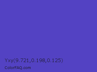 Yxy 9.721,0.198,0.125 Color is a normal indigo color and the nearest color is Ocean Blue #4f42b5. Hex code #5342c3 and RGB value is rgb(83,66,195). In RGB color space, this color is composed of 33% red, 26% green, 76% blue, In CMYK color space, this color is composed of 57% cyan, 66% magenta, 0% yellow , 24% black , In HSL color space, this color has a hue angle of 248° , 52% saturation and 51% lightness.