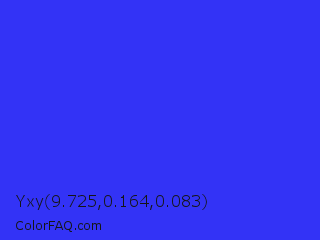 Yxy 9.725,0.164,0.083 Color is a normal blue color and the nearest color is Palatinate Blue #273be2. Hex code #3333f6 and RGB value is rgb(51,51,246). In RGB color space, this color is composed of 20% red, 20% green, 96% blue, In CMYK color space, this color is composed of 79% cyan, 79% magenta, 0% yellow , 4% black , In HSL color space, this color has a hue angle of 240° , 92% saturation and 58% lightness.
