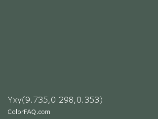Yxy 9.735,0.298,0.353 Color is a normal green color and the nearest color is Nandor #4b5d52. Hex code #4a5c53 and RGB value is rgb(74,92,83). In RGB color space, this color is composed of 29% red, 36% green, 33% blue, In CMYK color space, this color is composed of 20% cyan, 0% magenta, 10% yellow , 64% black , In HSL color space, this color has a hue angle of 150° , 11% saturation and 33% lightness.