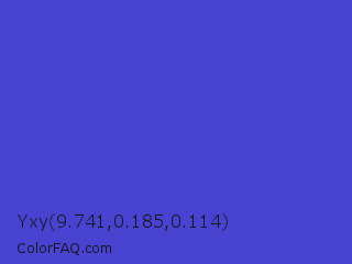 Yxy 9.741,0.185,0.114 Color is a normal indigo color and the nearest color is Iris #5a4fcf. Hex code #4742cf and RGB value is rgb(71,66,207). In RGB color space, this color is composed of 28% red, 26% green, 81% blue, In CMYK color space, this color is composed of 66% cyan, 68% magenta, 0% yellow , 19% black , In HSL color space, this color has a hue angle of 242° , 59% saturation and 54% lightness.