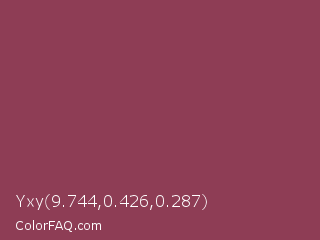 Yxy 9.744,0.426,0.287 Color is a normal rose color and the nearest color is Quinacridone Magenta #8e3a59. Hex code #8e3d55 and RGB value is rgb(142,61,85). In RGB color space, this color is composed of 56% red, 24% green, 33% blue, In CMYK color space, this color is composed of 0% cyan, 57% magenta, 40% yellow , 44% black , In HSL color space, this color has a hue angle of 342° , 40% saturation and 40% lightness.