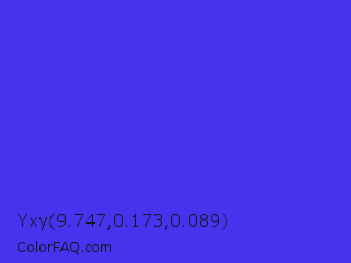 Yxy 9.747,0.173,0.089 Color is a normal indigo color and the nearest color is Han Purple #5218fa. Hex code #4633ed and RGB value is rgb(70,51,237). In RGB color space, this color is composed of 27% red, 20% green, 93% blue, In CMYK color space, this color is composed of 70% cyan, 78% magenta, 0% yellow , 7% black , In HSL color space, this color has a hue angle of 246° , 84% saturation and 56% lightness.