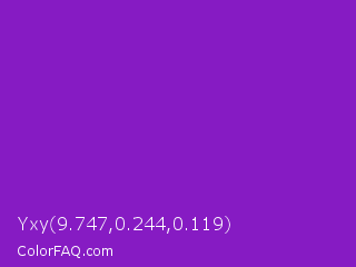 Yxy 9.747,0.244,0.119 Color is a normal purple color and the nearest color is French Violet #8806ce. Hex code #861bc3 and RGB value is rgb(134,27,195). In RGB color space, this color is composed of 53% red, 11% green, 76% blue, In CMYK color space, this color is composed of 31% cyan, 86% magenta, 0% yellow , 24% black , In HSL color space, this color has a hue angle of 278° , 76% saturation and 44% lightness.