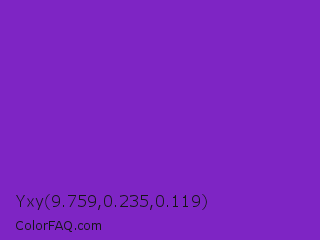 Yxy 9.759,0.235,0.119 Color is a normal purple color and the nearest color is Purple Heart Crayola #652dc1. Hex code #7e25c4 and RGB value is rgb(126,37,196). In RGB color space, this color is composed of 49% red, 15% green, 77% blue, In CMYK color space, this color is composed of 36% cyan, 81% magenta, 0% yellow , 23% black , In HSL color space, this color has a hue angle of 274° , 68% saturation and 46% lightness.