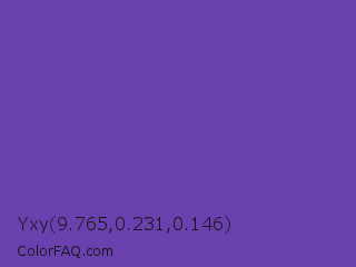 Yxy 9.765,0.231,0.146 Color is a normal violet color and the nearest color is Studio #714ab2. Hex code #6a40af and RGB value is rgb(106,64,175). In RGB color space, this color is composed of 42% red, 25% green, 69% blue, In CMYK color space, this color is composed of 39% cyan, 63% magenta, 0% yellow , 31% black , In HSL color space, this color has a hue angle of 263° , 46% saturation and 47% lightness.